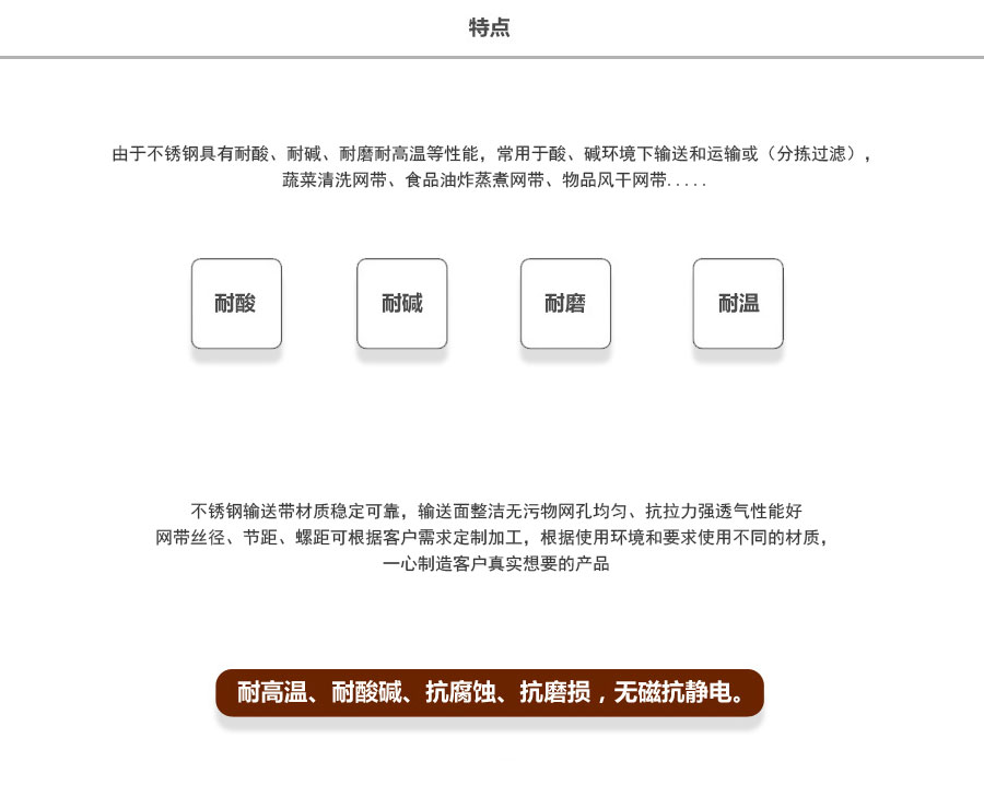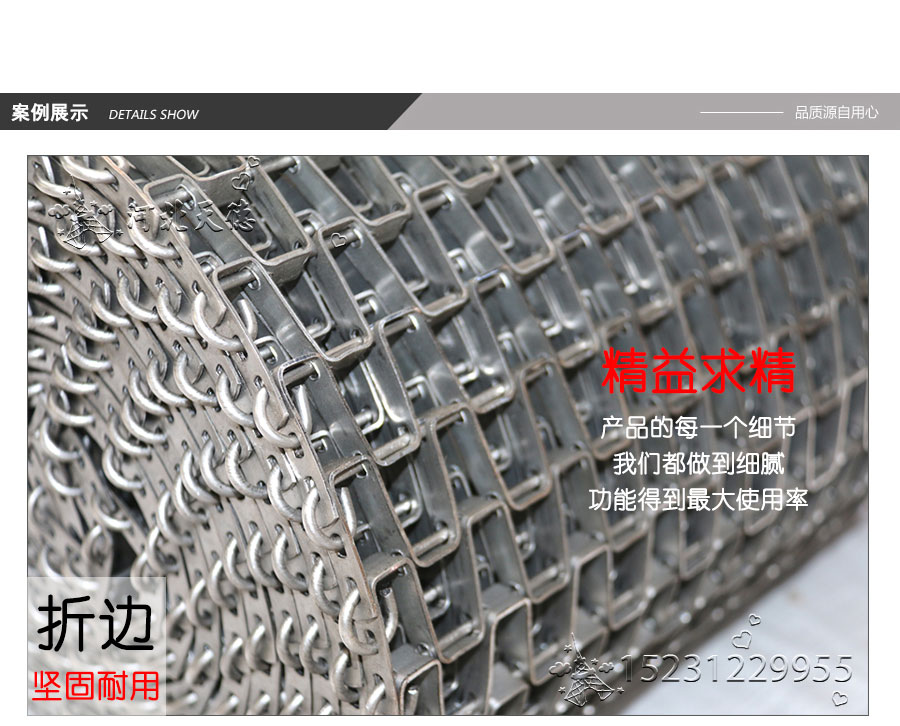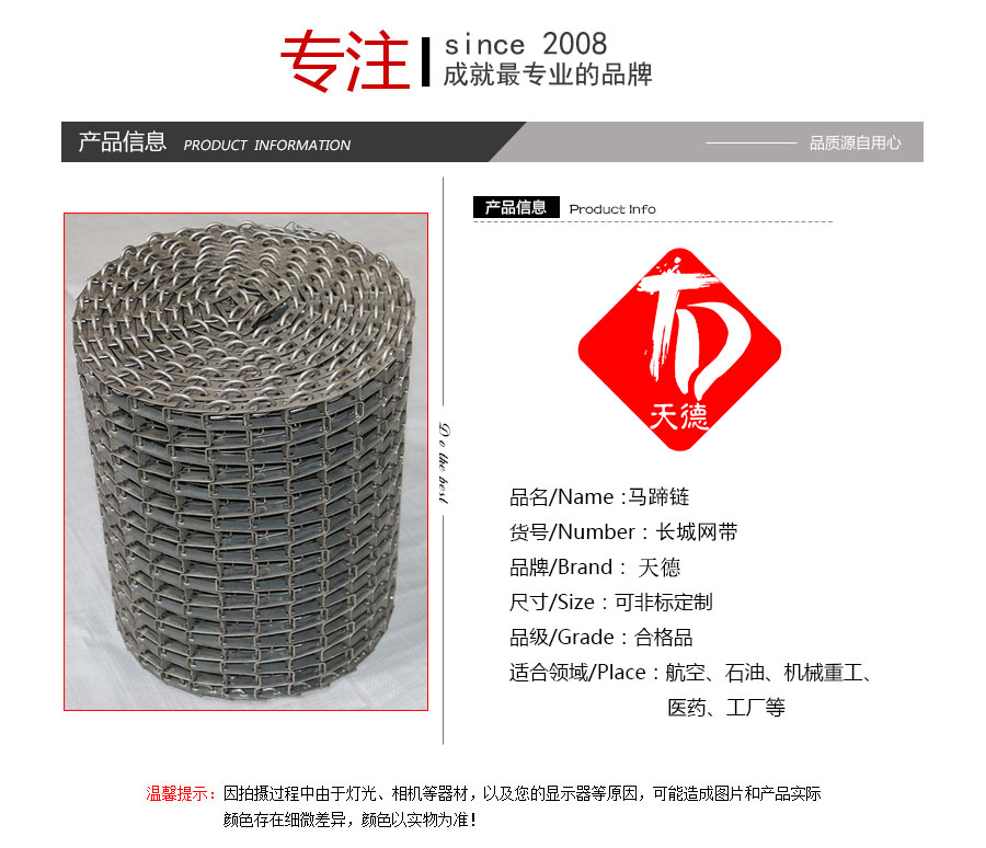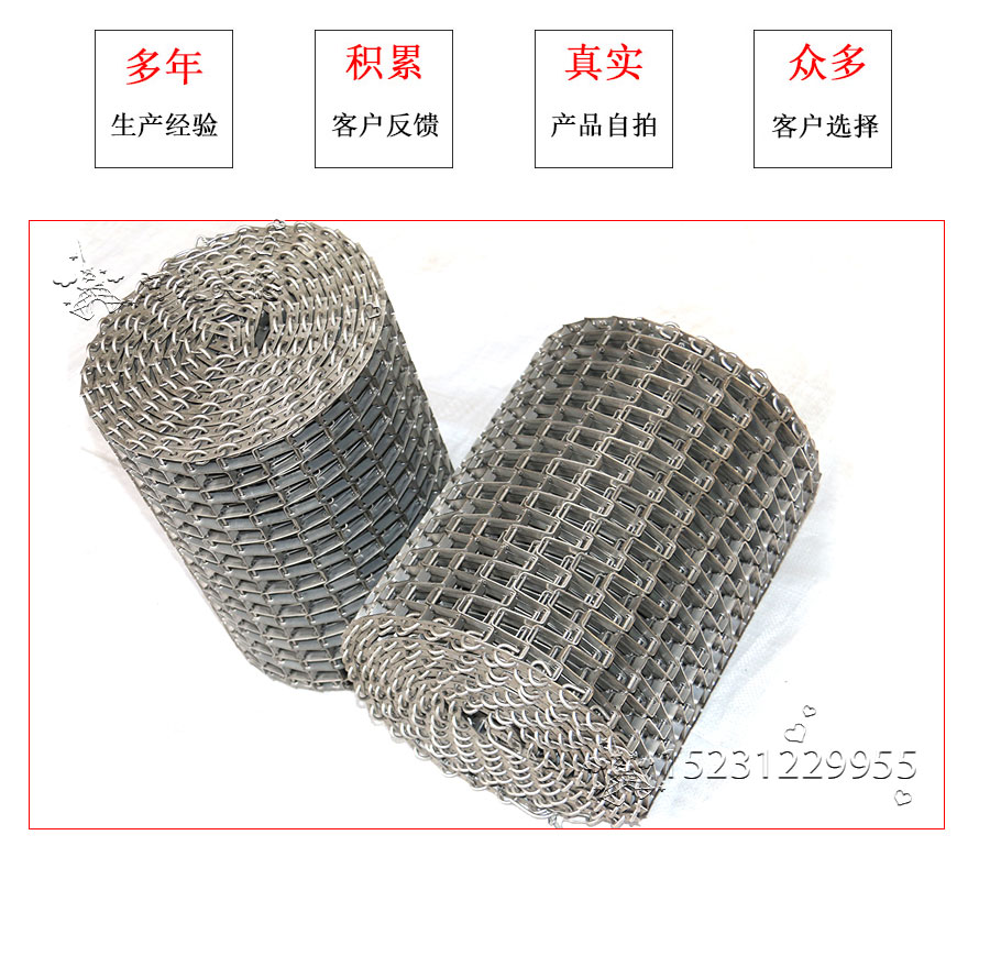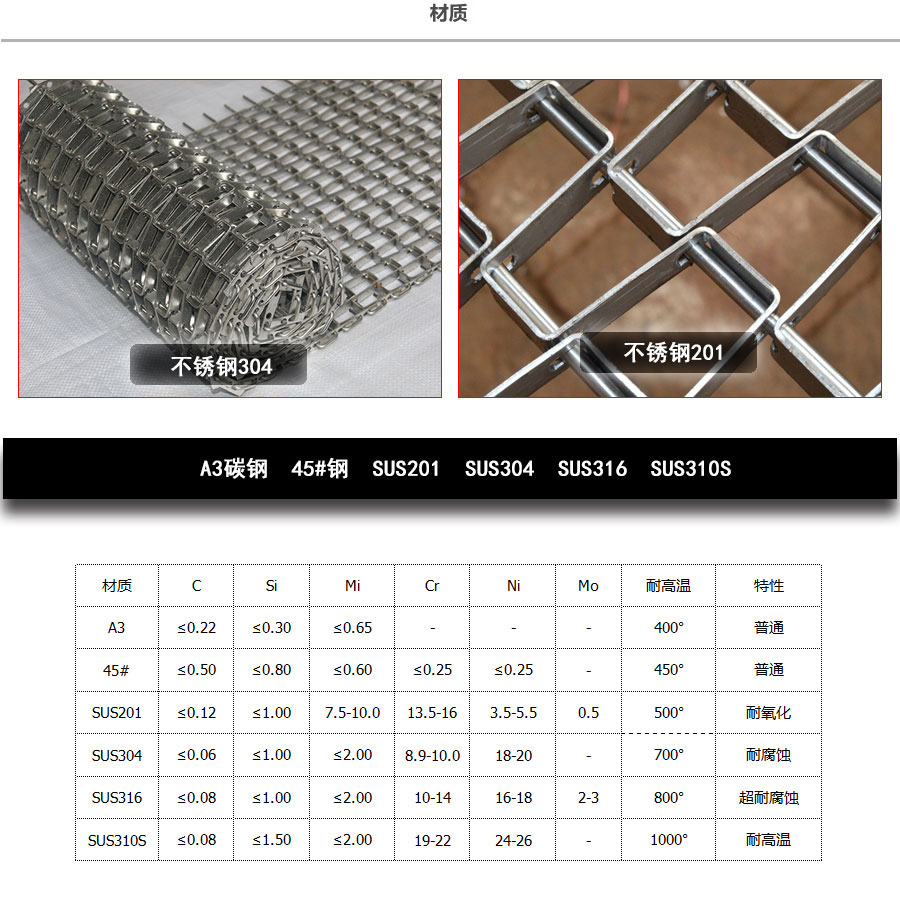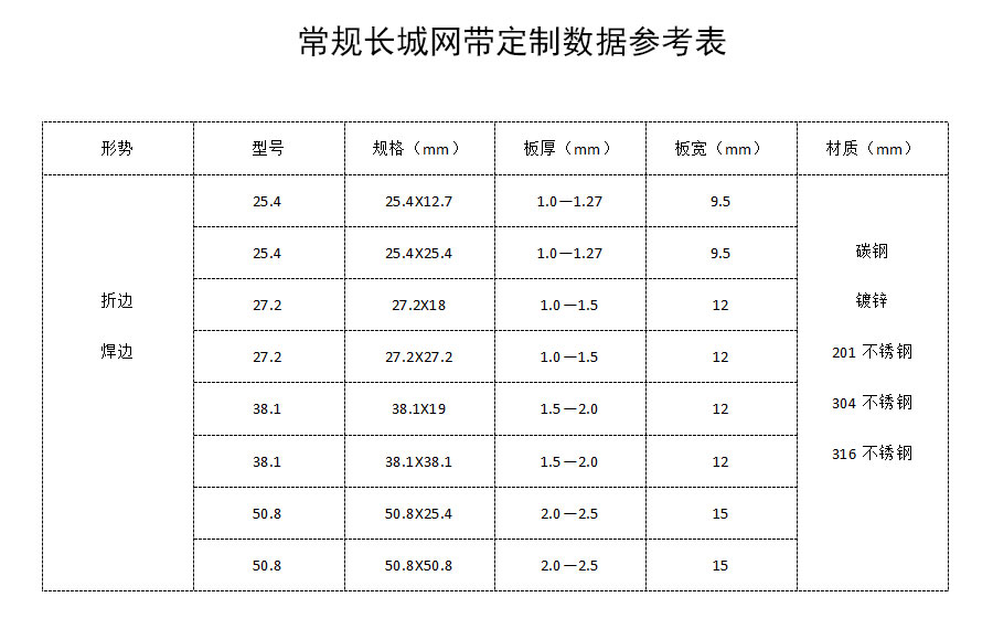 長城網(wǎng)帶材質(zhì):有A3低碳鋼、45#鋼、1Cr13耐熱鋼、 不銹鋼、304不銹鋼、1Cr18Ni9Ti不銹鋼、0Cr18Ni14NO2CU2耐熱耐酸鋼等