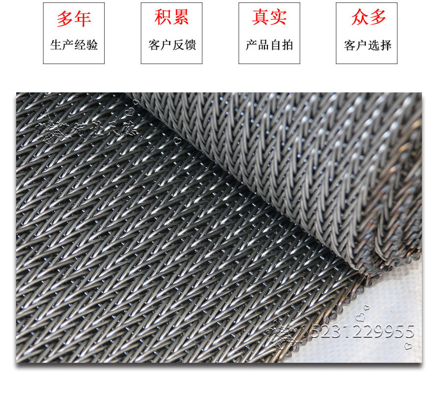 compound balanced weave belt is variant of the balanced weave belt, which is weaved successively with left spiral wire and right spiral wire, the hole size is very small. usually use the straight rod. this type belt is suit for small size goods because it's tightness, such as:nuts, bolts, screws, nails, cookie type particles etc..