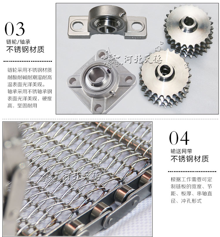 1.網帶輸送機以不銹鋼網帶為輸送介質,其特性堅固,耐磨、不拍尖銳的物品劃傷,輸送豬肉、雞鴨、魚蝦等干凈衛生;