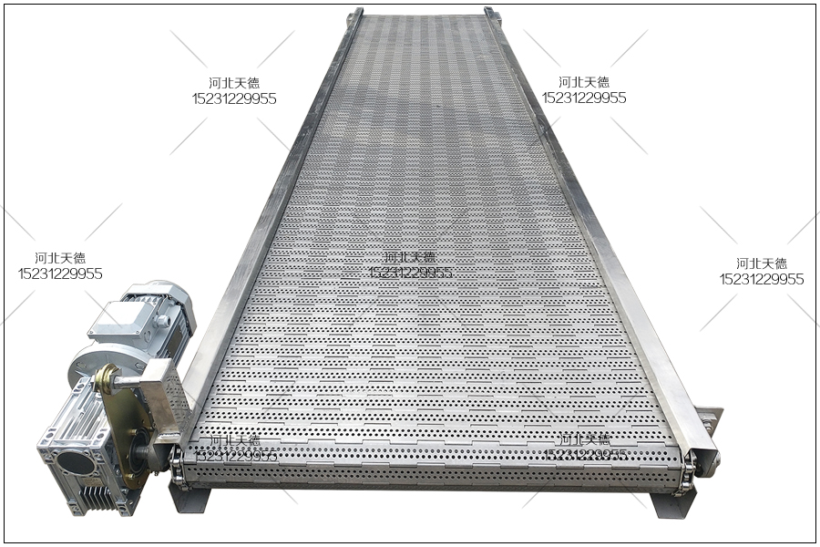 這臺(tái)鏈板不銹鋼輸送機(jī)的總長(zhǎng)度為5米,輸送機(jī)總寬度為0.8米,沒有腿,客戶自己根據(jù)需要在焊 接機(jī)腿。采用3.0毫米厚度的鋼板折彎加工成的機(jī)身,不銹鋼鏈板輸送帶的板厚為2.0毫米,輸送鏈條節(jié)距為38.1毫米,桿直徑為8毫米,鏈板輸送帶表面打孔的直徑為3.0毫米。配套使用的鏈輪為直徑120毫米左右的。電機(jī)采用0.75千瓦電機(jī),配套使用的減速機(jī)、變頻器都會(huì)安裝好。